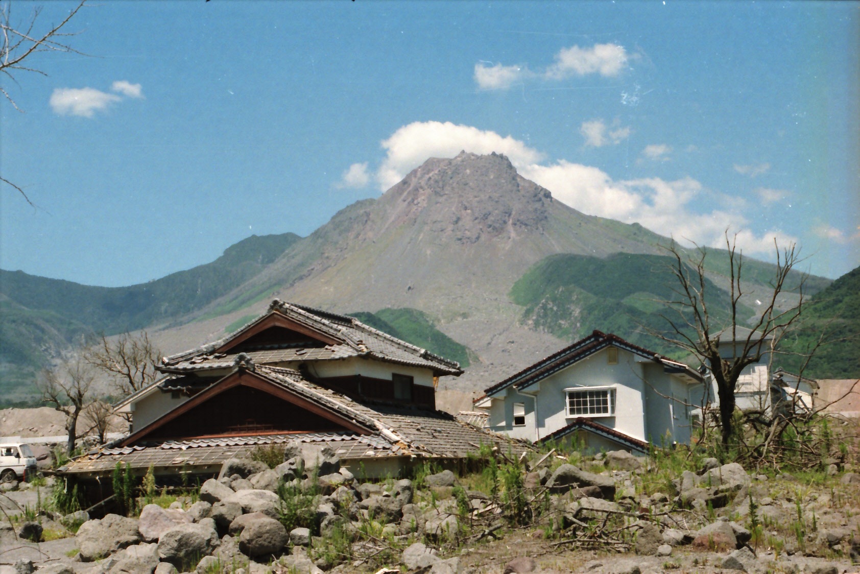 雲仙火山では、人々は噴火のたびに泥流や土石流の被害と闘ってきました。現在は、近代的な砂防工事によって、住民の暮らしが守られています。