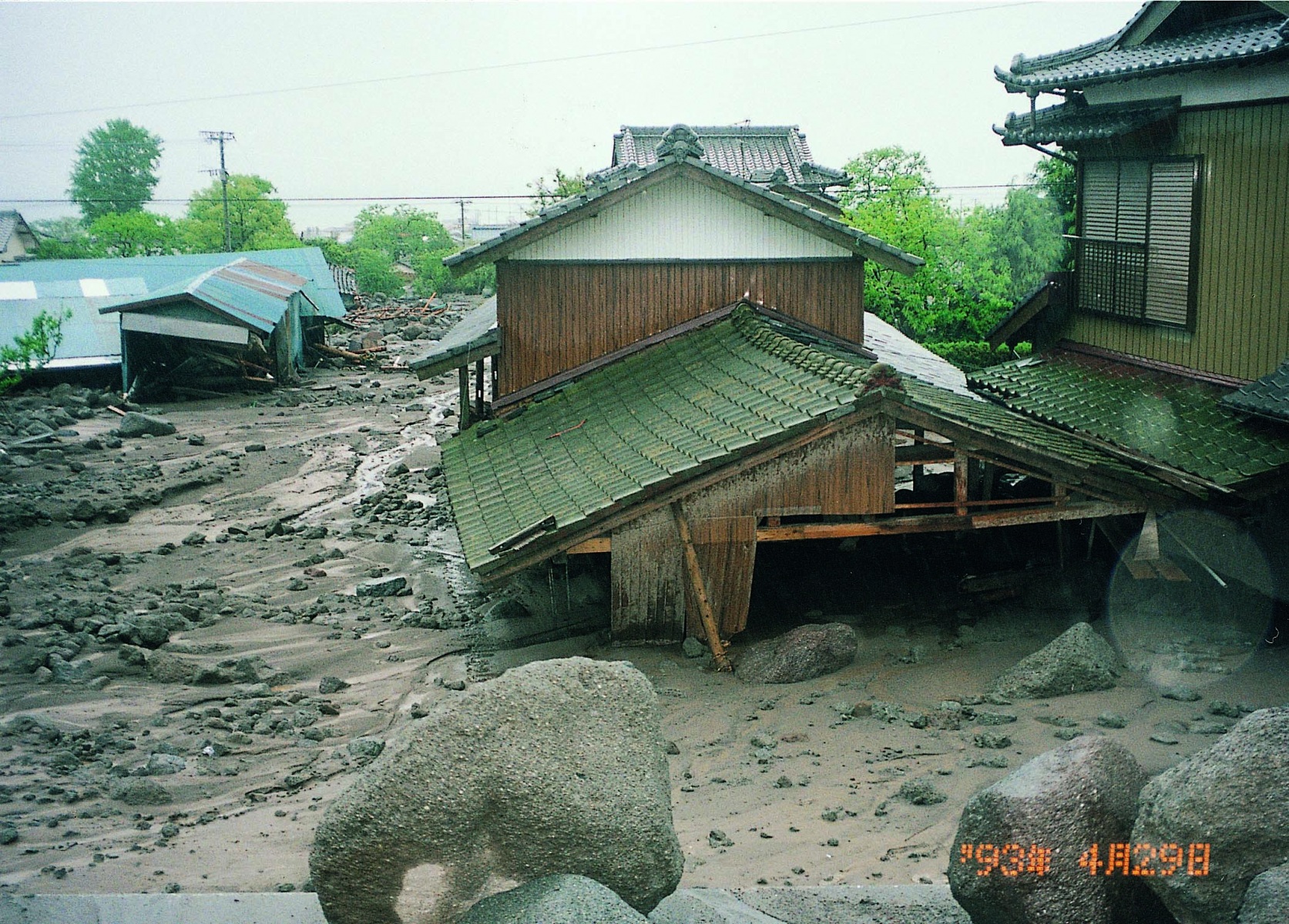 雲仙火山では、人々は噴火のたびに泥流や土石流の被害と闘ってきました。現在は、近代的な砂防工事によって、住民の暮らしが守られています。