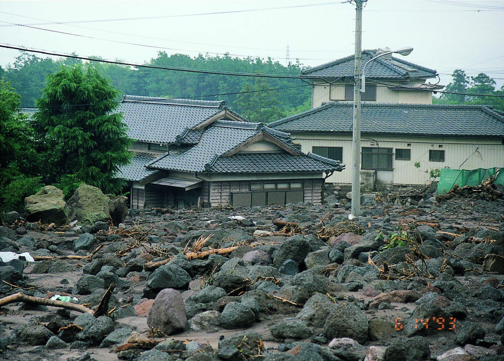雲仙火山では、人々は噴火のたびに泥流や土石流の被害と闘ってきました。現在は、近代的な砂防工事によって、住民の暮らしが守られています。